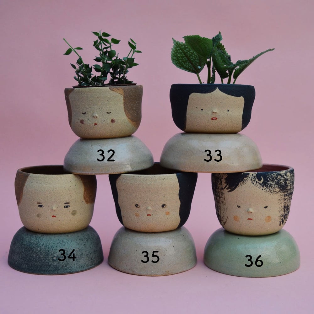 Wheel-thrown planters in the style of “niñas y chicos” (but with shoulders!) made from the "custard" clay body. The top portion holds a small plant, while the bottom portion creates space for drainage. You can place a secret dish underneath to catch water or simply place the planter on a plate. Hand painted and hand sculpted facial features. Each piece is one-of-a-kind. Glaze colors vary depending on character.